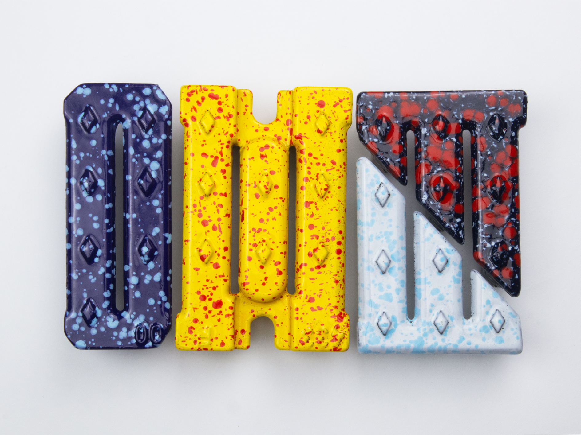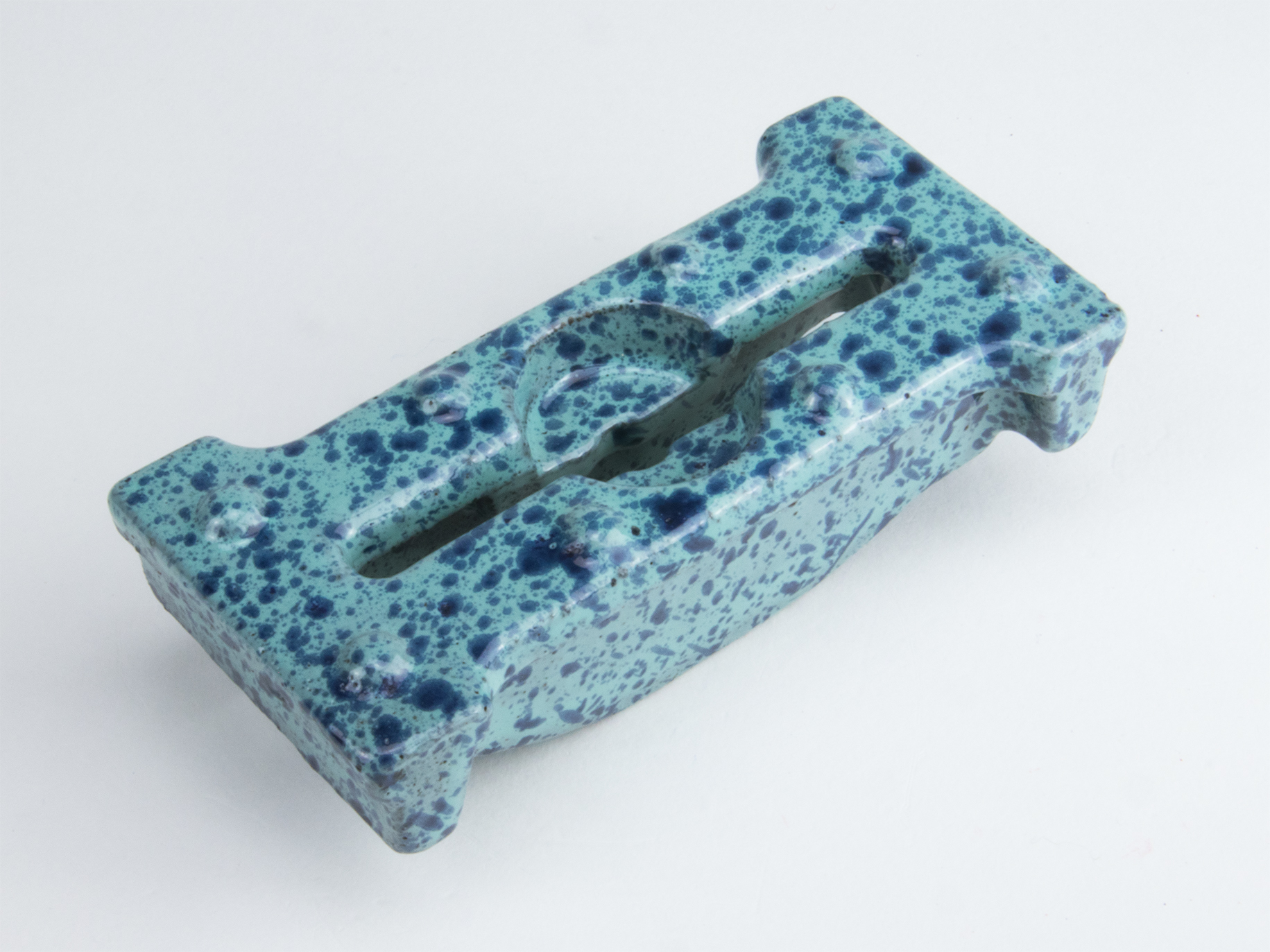 Vitreous enamelled soap dishes made from reclaimed cast iron drain covers/grilles. After being cut into smaller pieces, sharp edges ground and surfaces shot-blasted to remove rust, the soap dishes are vitreous enamelled in a furnace at around 800°C.