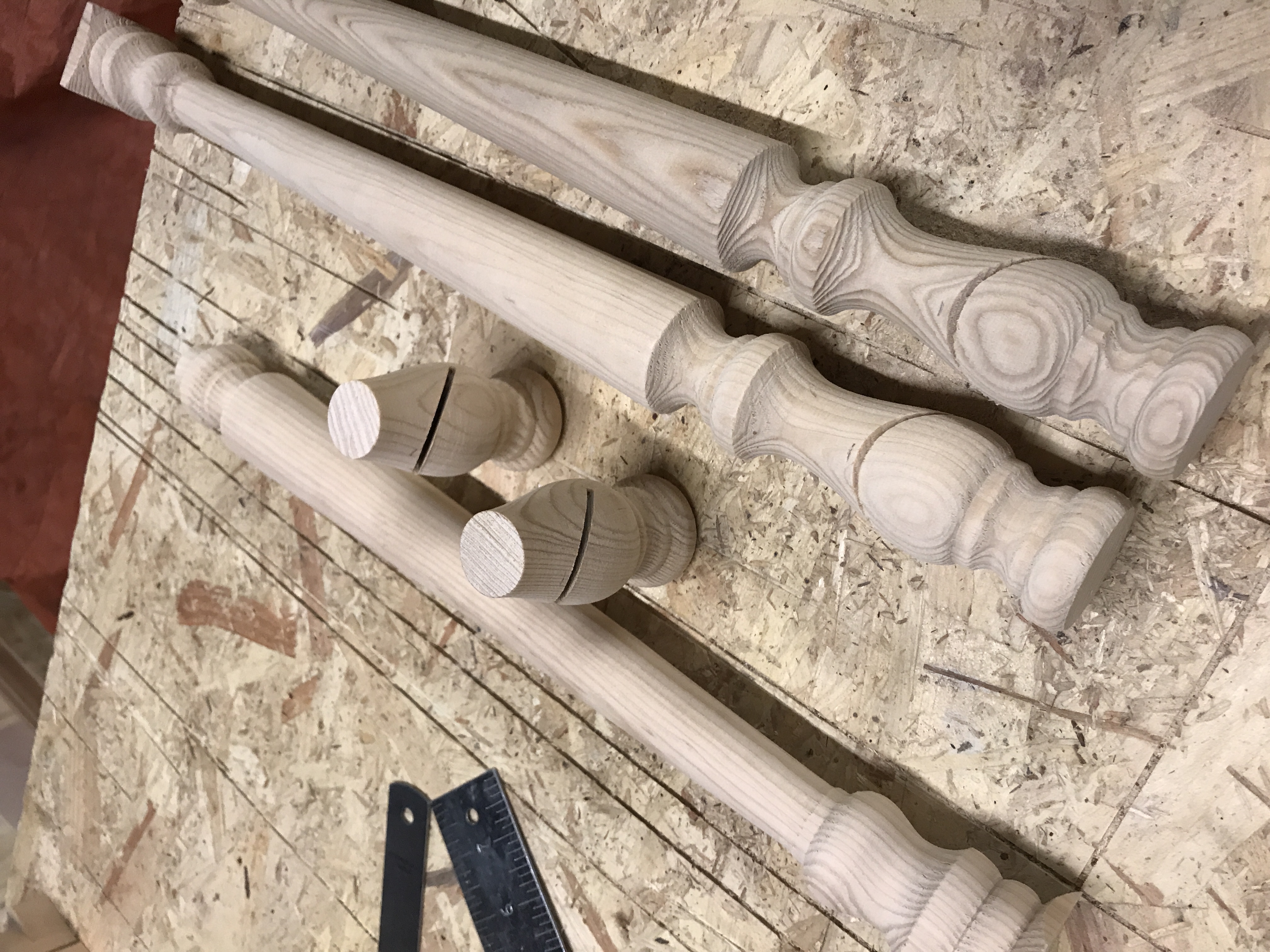 Spliced hemlock stair banisters cut at different angles to make a full chess set. The square section at the two ends of the spindles are cut into blocks to make the board. The black side are stained with Indian ink.