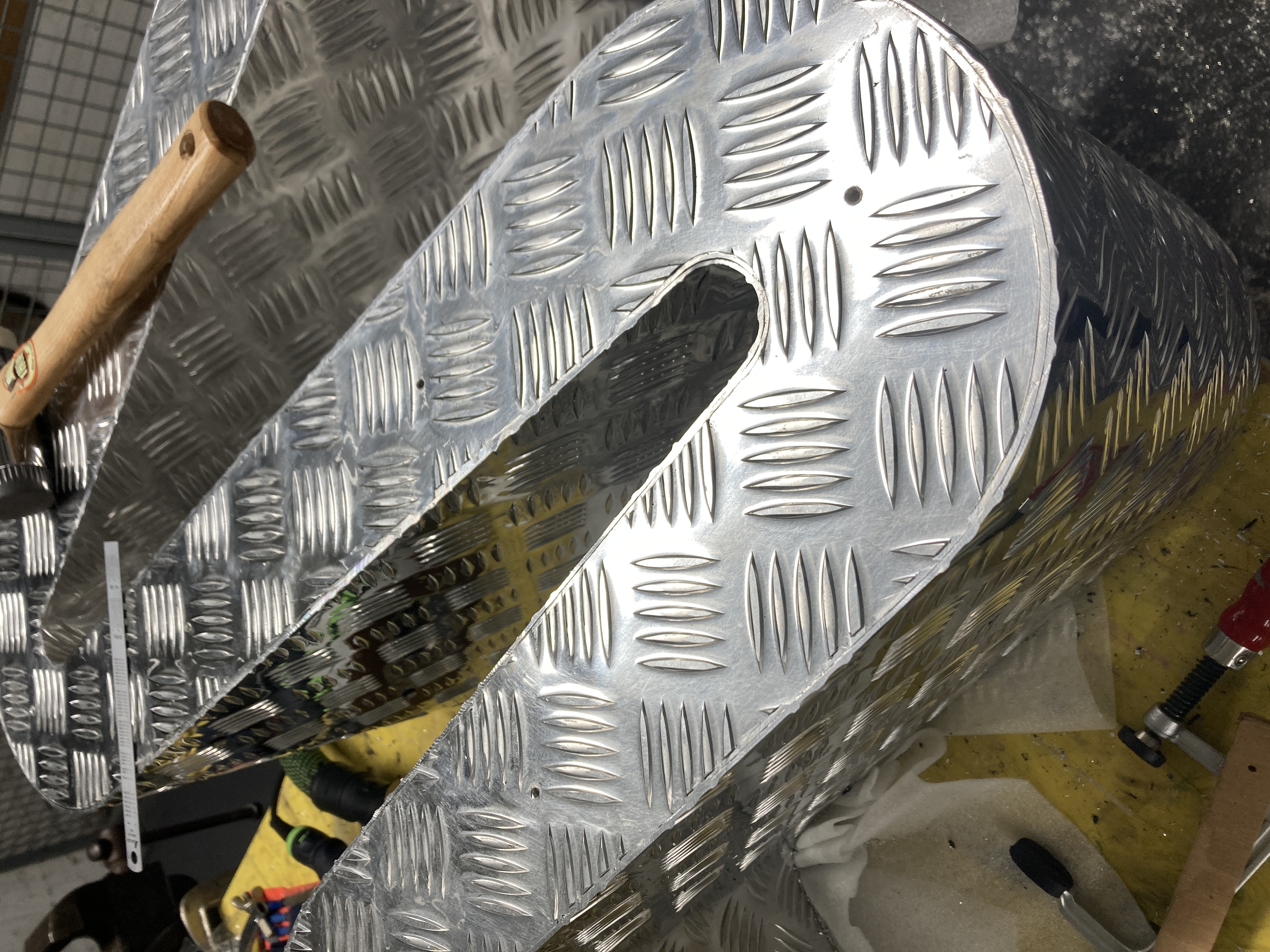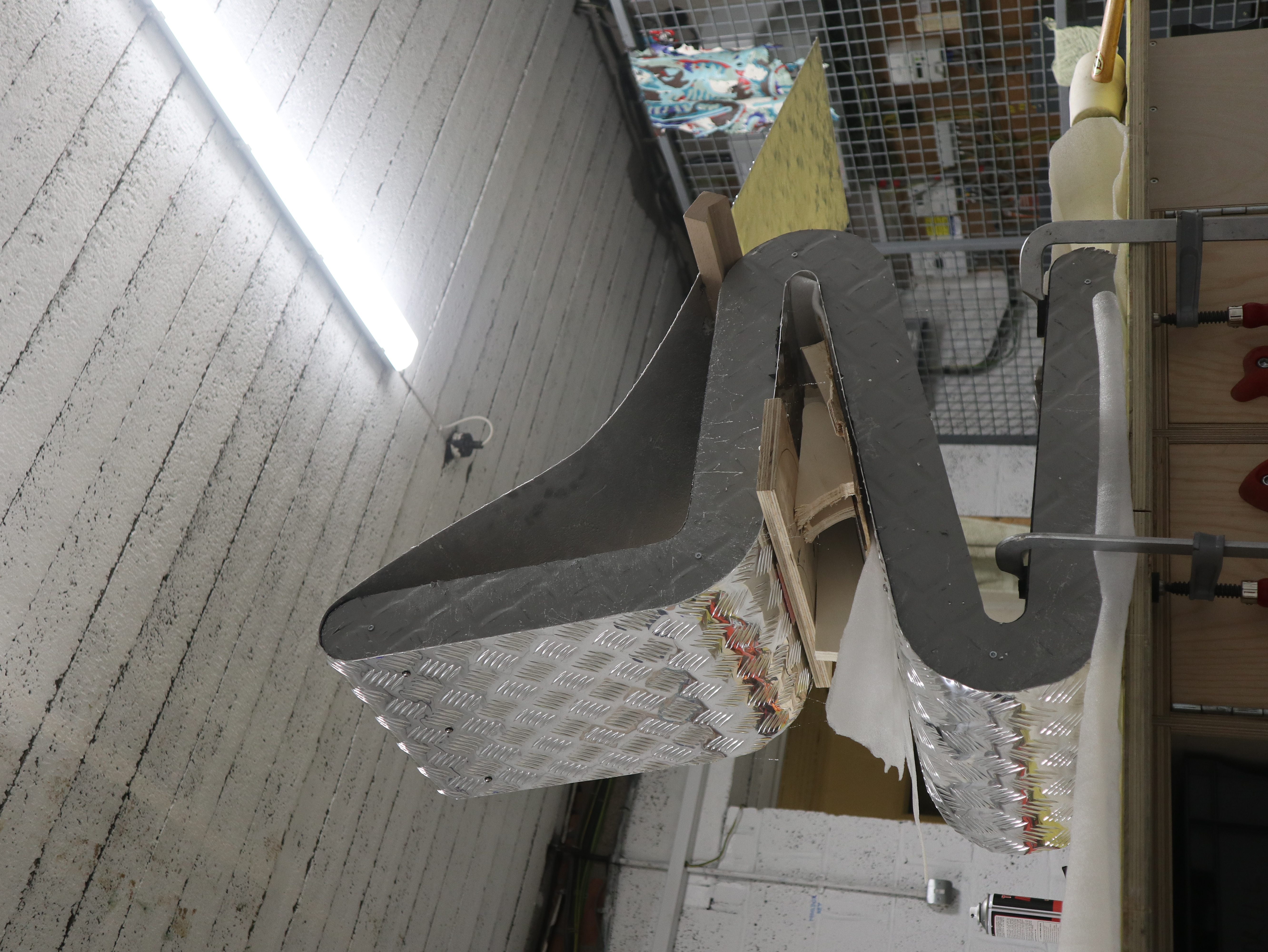 The sheet metal is hand-beaten around a solid plywood carcass and screwed and glued into position. Stainless screws, nylon washers, nylon feet.